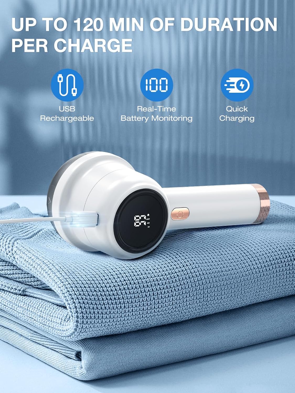 ✨ Equipped with six sharp rotating blades — efficiently shaves away lint, pilling, and fuzz from sweaters, blankets, and upholstery in seconds!